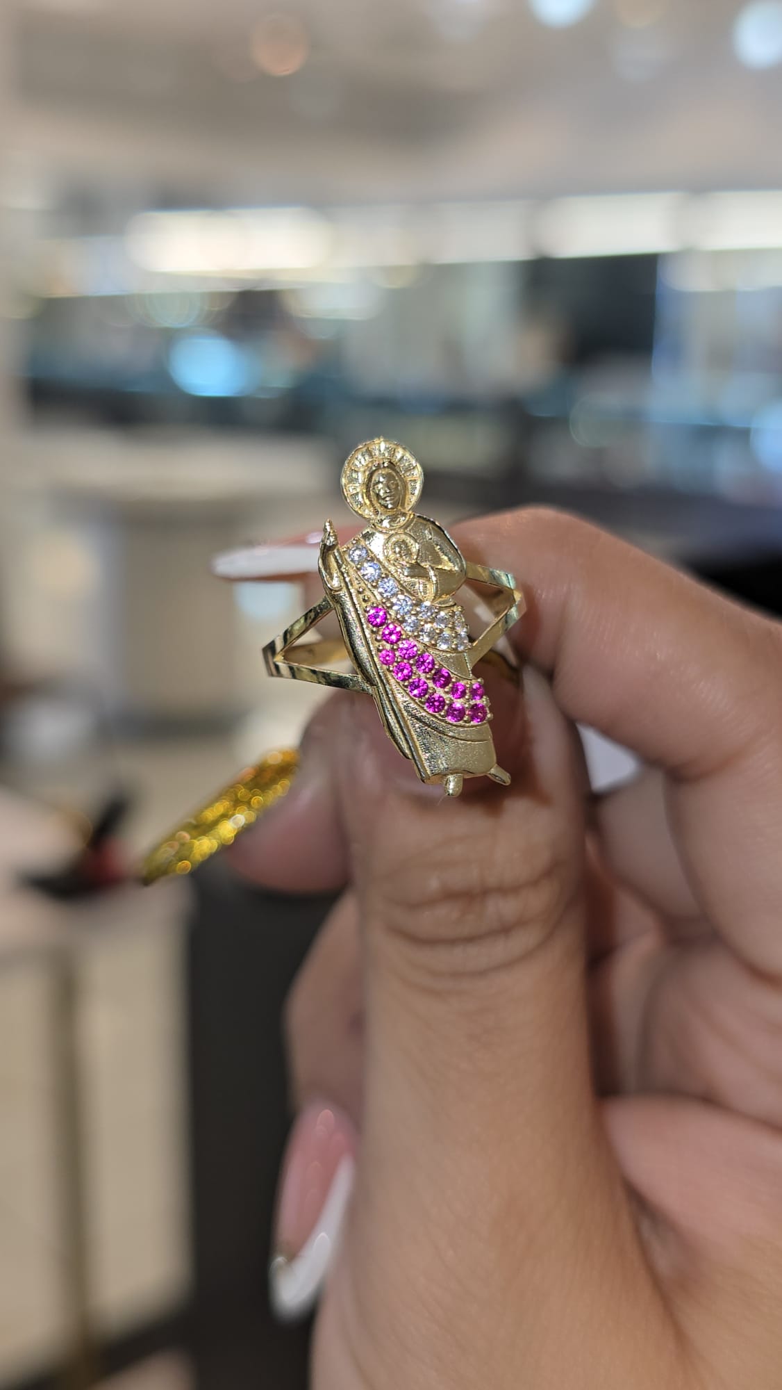 San Judas Ring – 10K Gold with Cubic Zirconia & Pink Accents