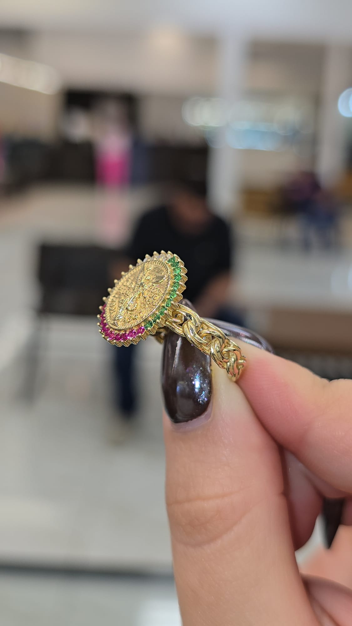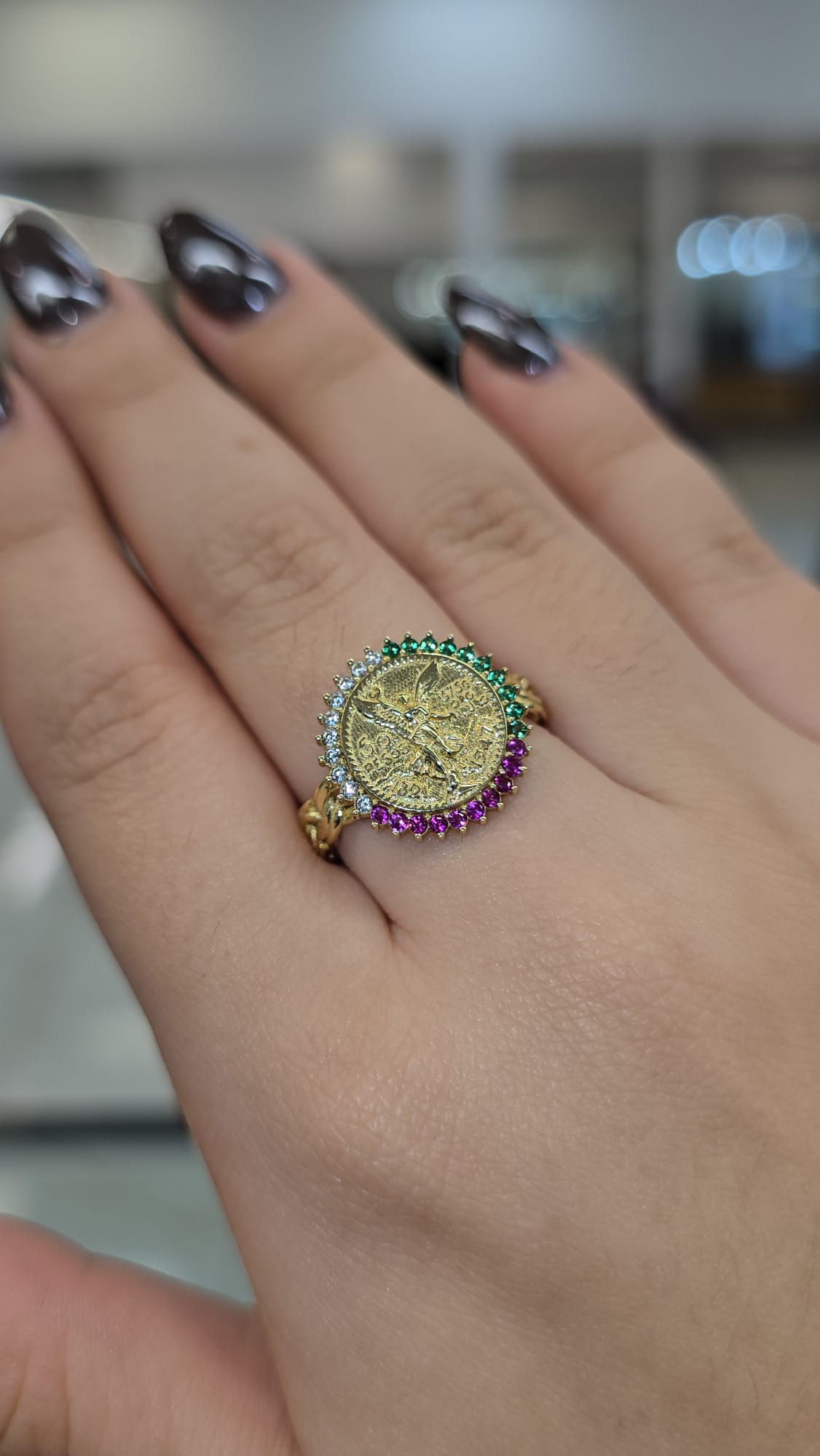 A tribute to legacy, pride, and craftsmanship. This 10K gold Centenario ring features a detailed central medallion design, framed by a vibrant border of white, green, and red cubic zirconia stones — colors that honor tradition and make a bold visual impact.